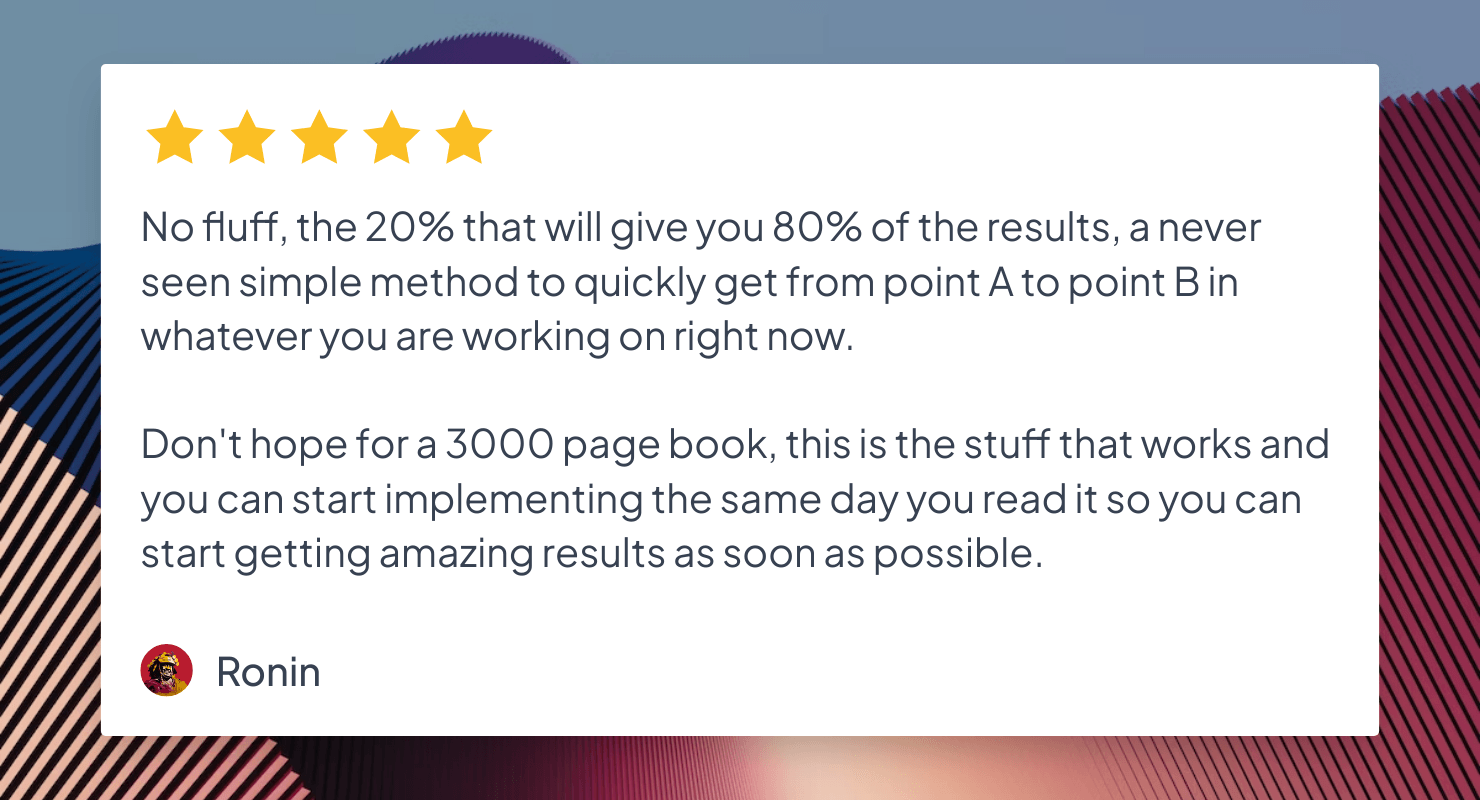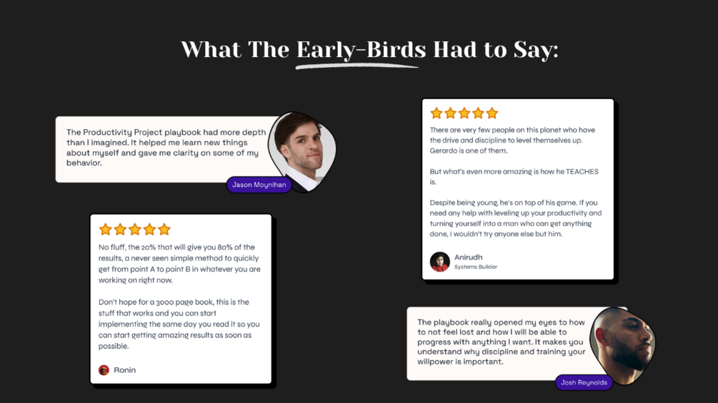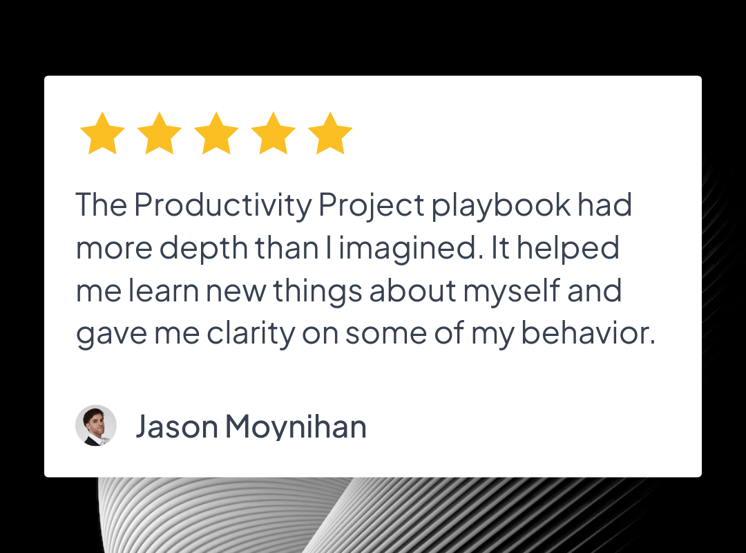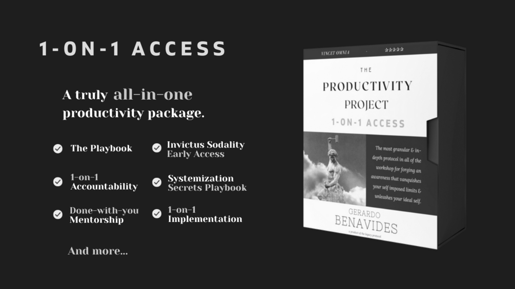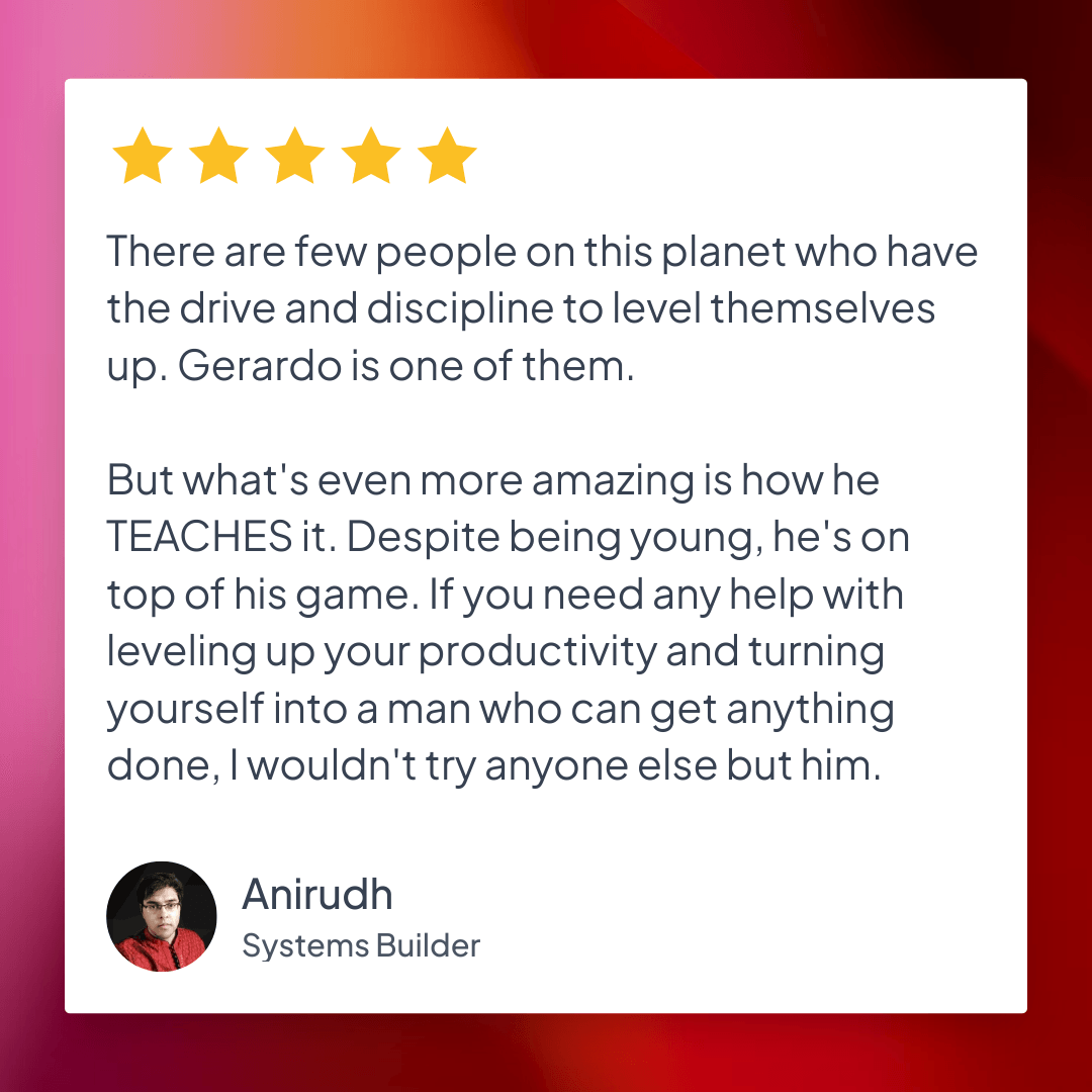 - Helped you 1-on-1 to calibrate productivity systems personalized for you and your current needs in just 1 hr a day